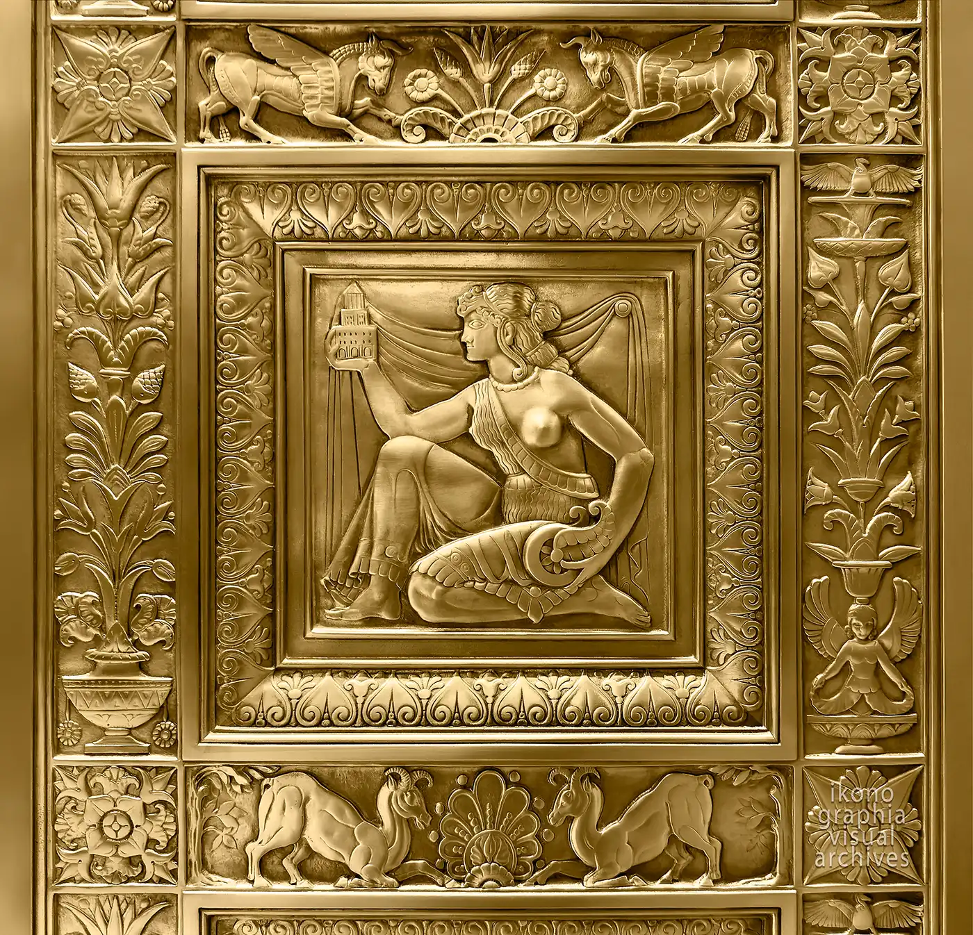 Elevator Doors — Eight gilded bronze panels embodying Industry, Commerce, Finance, and Building. These allegorical reliefs translate the forces driving New York's rise into sculptural form. The arrangement on the doors is graphically balanced, not thematically ordered. The eye moves across figures and ornament before resolving into program. The logic reveals itself slowly — four themes, eight figures, one coherent argument about what a city is and what sustains it.