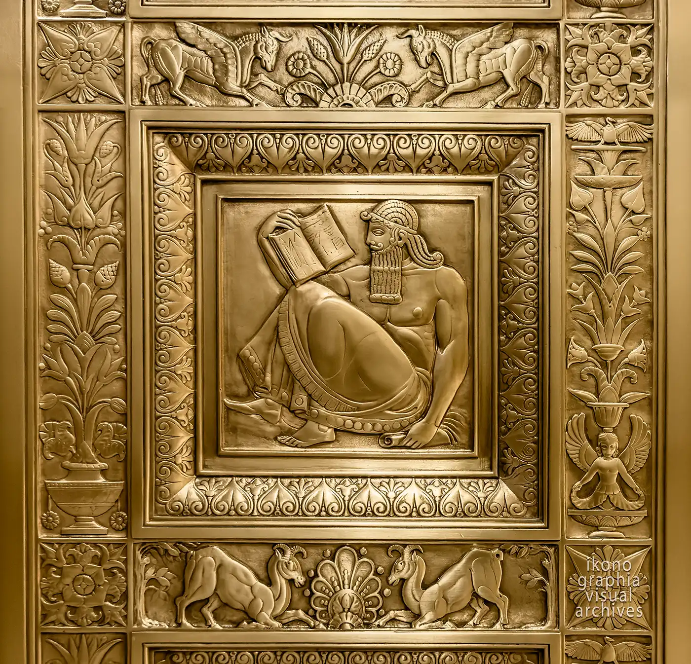 The barrel-vaulted lobby ceilings are painted in gold, black, and bold colour, depicting Babylonian mythological figures: dragons, bulls, lions, and winged griffins drawn from the same sources that informed Glinsky's bronze. Who painted these vaults has not been confirmed in primary sources. What is certain is that whoever did so was working within a visual language already fully established by the bronze program surrounding them.