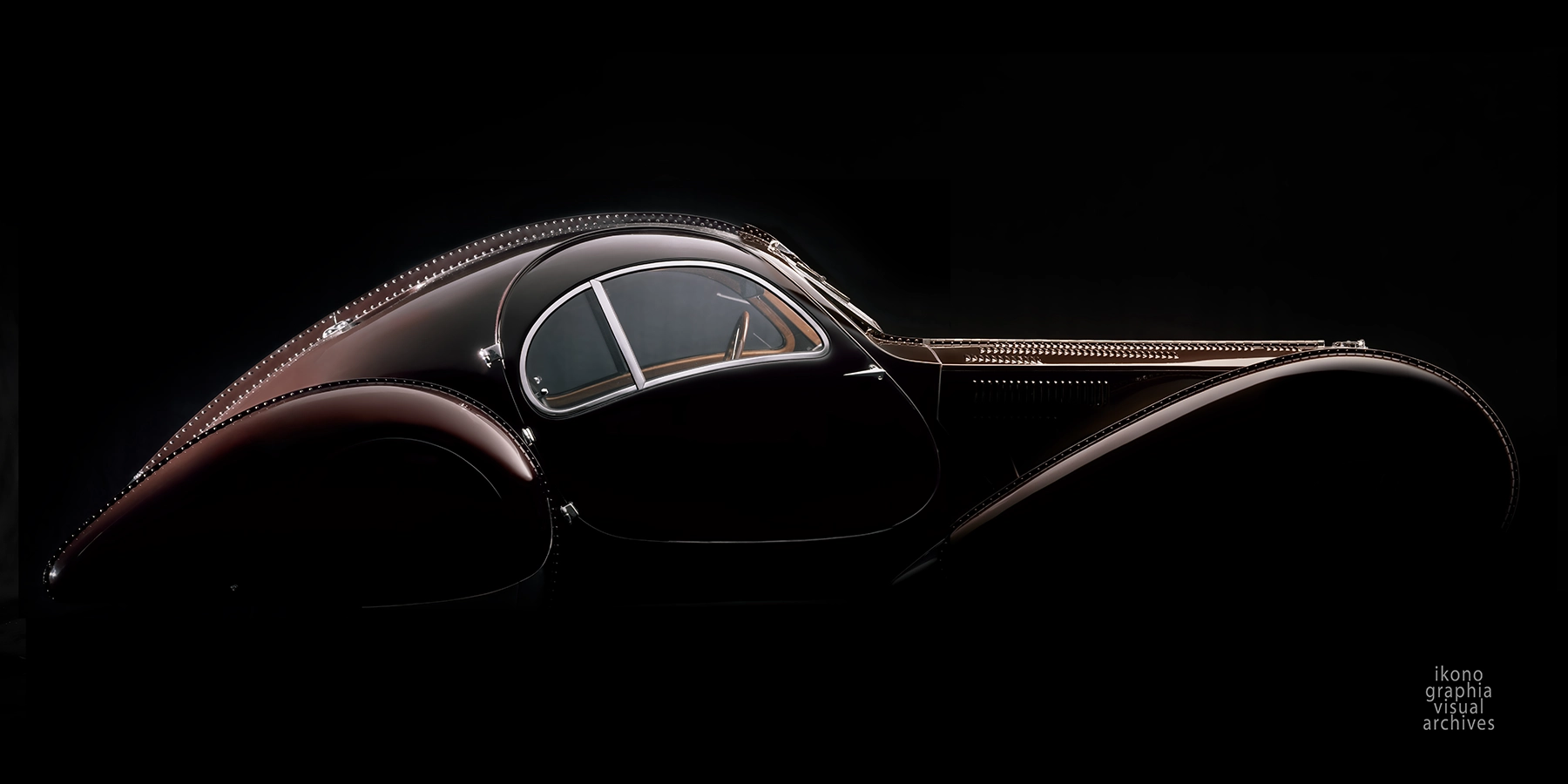 The Bugatti Type 57SC Coupé Atalante — here, the lighting system was pushed to its extreme, creating a single continuous line against the black — The essence of Jean Bugatti Design.