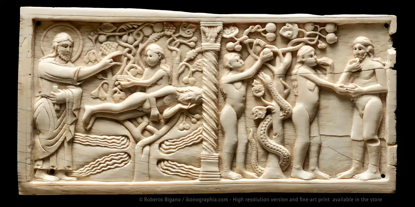 Creation of Eve – Temptation and Original Sin. Old Testament Ivory Carving